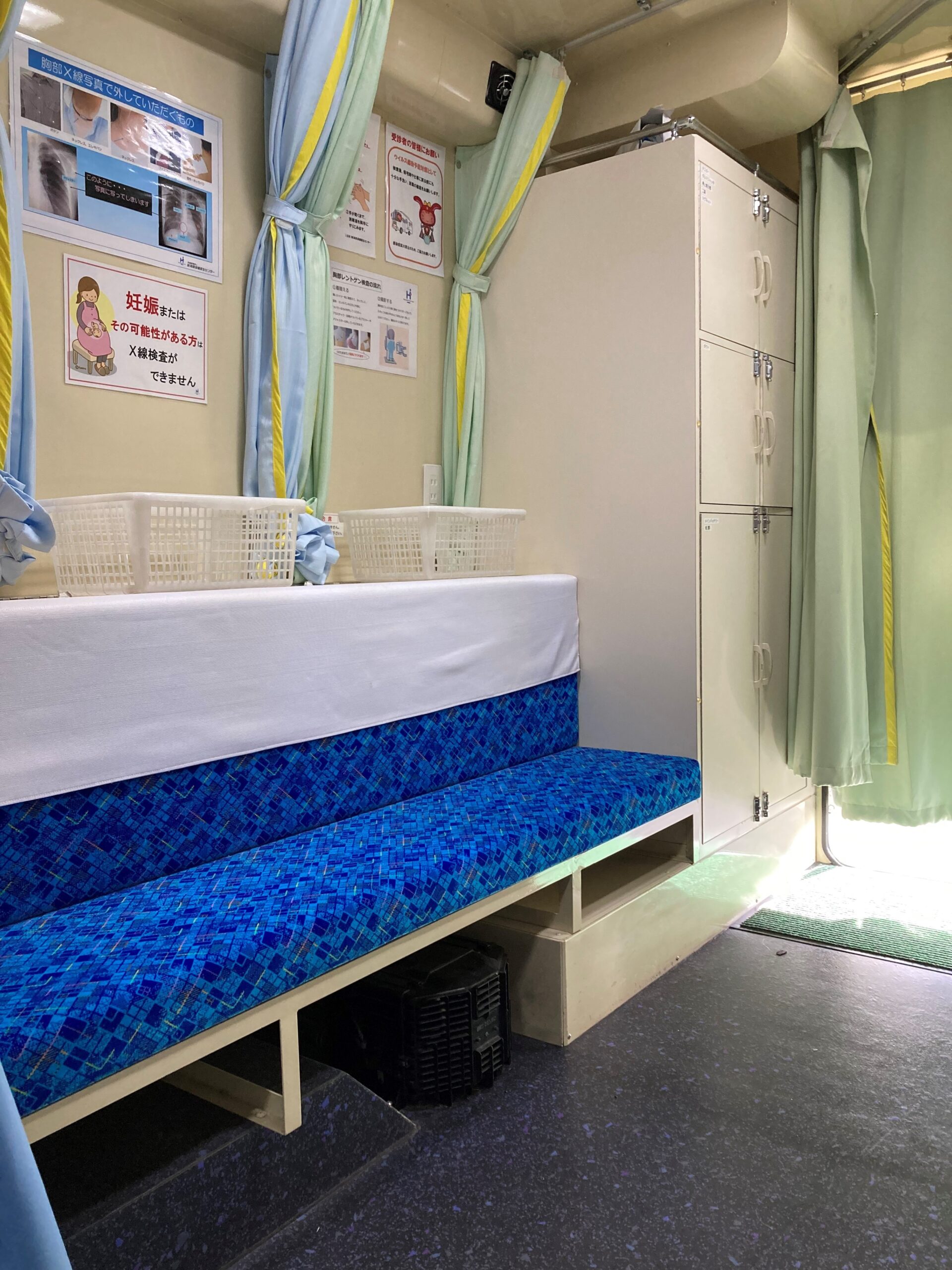 現在の検診車内は十分とは言えませんがゆとりがあり、カーテンを用いることによって個別の更衣スペースが確保できるようになっています。更に近年では、検診車の出入口を少しでも乗り降りしやすいよう、階段の段差や段数を出来る限り少なくし、室内の段差をできるだけなくし、手すりを多用するなど、安全面に重点を置いた設計を心がけています。開始当初は撮影することに重きを置かれていたため、現在に比べると乗り降りや移動しにくい環境にあったと思われます。